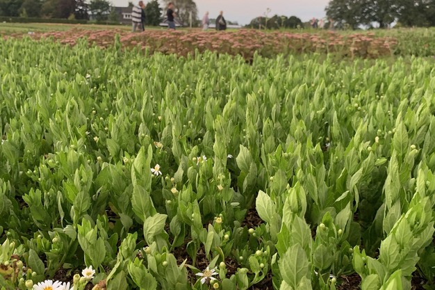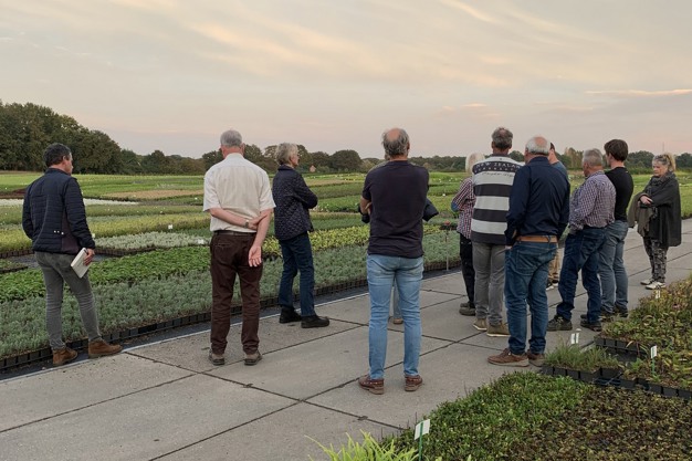 Op maandagavond 23 september was Biologische Sierteelt Nederland met 13 geïnteresseerden aanwezig tijdens een bezoek. "De rit naar de kwekerij is al prachtig. Tijdens het laatste stuk vanaf Ommen slingert de weg door dorpen afgewisseld met weilanden en stukken bos. Het was nagenoeg windstil en helder. De kwekerij ligt er heel mooi, glooiend zelfs. In de avondzon kregen wij een rondleiding over terrein van deels akker (volle grond waarop de moederplanten staan) en een groot terrein waar de rechte bedden containerteelt – de trays met vierkanten potten – zich bevinden van maar liefst 1300 verschillende vaste planten," vertelt Jantien van Leeuwen van Biologische Sierteelt Nederland. Een overgroot deel van de planten vermeerdert Marten zelf. In de vollegrond staan de moederplanten waarvan wordt gestekt en gescheurd.