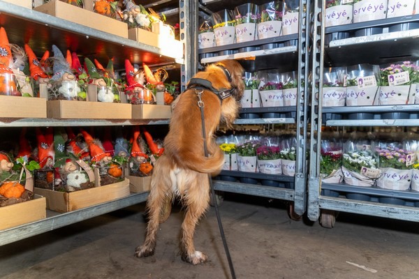 Afgelopen vrijdag vond er op initiatief van de aanpak Weerbare Sierteeltsector en vier exporteurs een controle met honden plaats op het terrein van Royal FloraHolland in Rijnsburg. De controle is ingezet als preventiemiddel om criminele praktijken tegen te gaan. De honden zijn getraind voor het opsporen van bijvoorbeeld verdovende middelen of vuurwerk. Zij lopen met hun begeleider door de hal, de docks en rondom de vrachtwagens en waar zij iets ruiken gaan ze stil zitten.