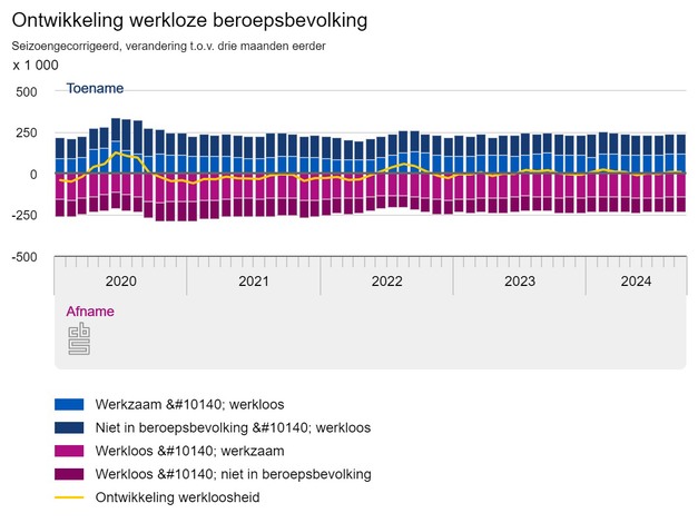 In september 2024 waren er 377 duizend werklozen. In de afgelopen drie maanden kwamen er gemiddeld 2 duizend per maand bij. Net als in augustus was het werkloosheidspercentage 3,7. Het aantal mensen met betaald werk daalde de afgelopen drie maanden met gemiddeld 13 duizend per maand en bedroeg 9,8 miljoen in september. Dit meldt het CBS op basis van nieuwe cijfers. UWV registreerde eind september 172 duizend lopende WW-uitkeringen.