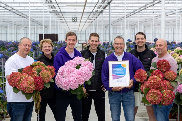 Met trots introduceert DFG de eerste genomineerde in de categorie bloemen: Pico Bello Hortensia. Dit familiebedrijf verzorgt met veel passie de teelt van schitterende snijhortensia's. Paul, Bob, Danny, Richard en Yvonne Kouwenhoven, werden van harte gefeliciteerd door John van de Polder (OZ-Hami) en Michel Stieva (Barendsen). In de kleurrijke kas spraken ze over de succesvolle samenwerking, geheel in lijn met het thema van dit jaar: 'long-term partnerships'.