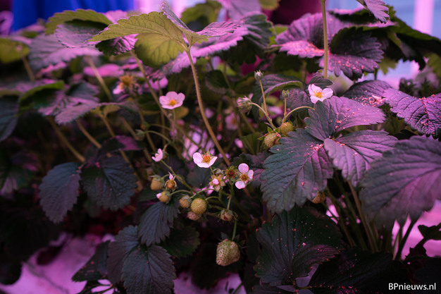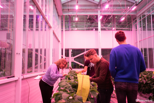 Tholen - In één van de kassen van World Horti Center zijn vier studenten van de opleiding Horti Technics & Management druk in de weer met de teelt van jonge aardbeienplanten. De kas kleurt 'roze' door de LED-belichting, de plantjes krijgen vruchten en de hommels vliegen rond.