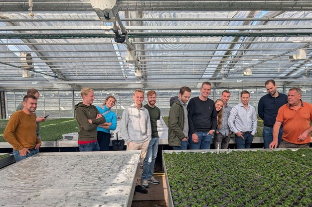 Na de presentatie van Mads was het tijd om de kwekerij te zien. Torben Roll nam ons mee de slakwekerij in. Maar hij noemde het ook wel een slafabriek, in de kas zelf komt namelijk niemand buiten de twee telers. Het productieproces was ook grotendeels geautomatiseerd, waarbij er een continue roulatie is met teeltgoten waar de sla automatisch uit geoogst wordt, om vervolgens weer vrijwel automatische opnieuw gezaaid de kas in te gaan.