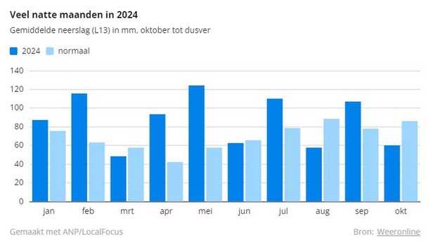 In vier van de afgelopen tien maanden viel gemiddeld over het land meer dan 100 mm. In februari viel 116 mm tegen 63 normaal en mei noteerde 124 mm tegen 58 normaal. In juli viel 110 mm tegen 79 en in september zat 107 mm in de regenmeter tegen 78 normaal. De maanden maart, juni en augustus waren (iets) droger dan gebruikelijk en met nog ruim een week te gaan is ook oktober tot dusver een droge maand.