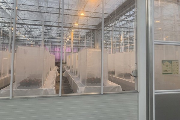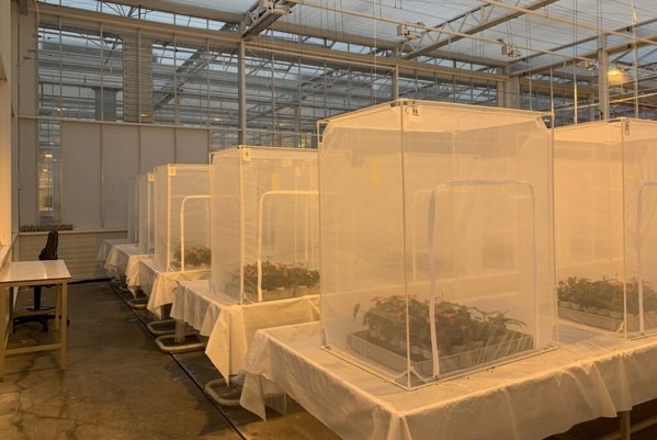 De opzet van het onderzoek werd gedaan met PP1L anthurium pluggen. Totaal werden 180 pluggen verdeeld over twee trays van 90 stuks per gaaskooi. Het onderzoek hebben we in tweeën verdeeld: één met natuurlijke vijanden en één met groene insecticiden.