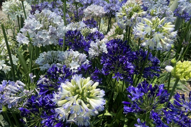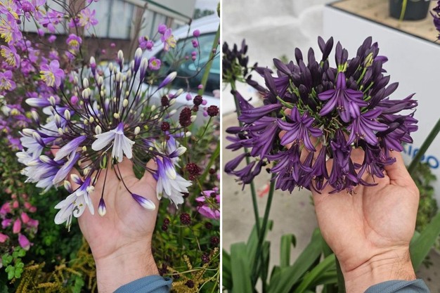 Chelsea International Flower Show: Bekroonde Agapanthus FIREWORKS (3e-2018) links en Agapanthus BLACKJACK (1e-2023) rechts; veredeld door De Wet Plant Breeders