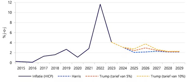 - Scenario 2: Donald Trump wint de Amerikaanse verkiezingen en voert in 2025 een extra universeel invoertarief in van 5%.