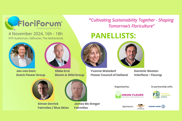 Union Fleurs, de International Flower Trade Association, en FSI, het Floriculture Sustainability Initiative, hebben de bevestigde line-up van panelleden bekendgemaakt die allen de uitnodiging hebben geaccepteerd om bij te dragen aan een discussie op Floriforum op maandagmiddag 4 november (16.00-18.00 uur) in het auditorium van IFTF aan de vooravond van de opening van de beurs.
