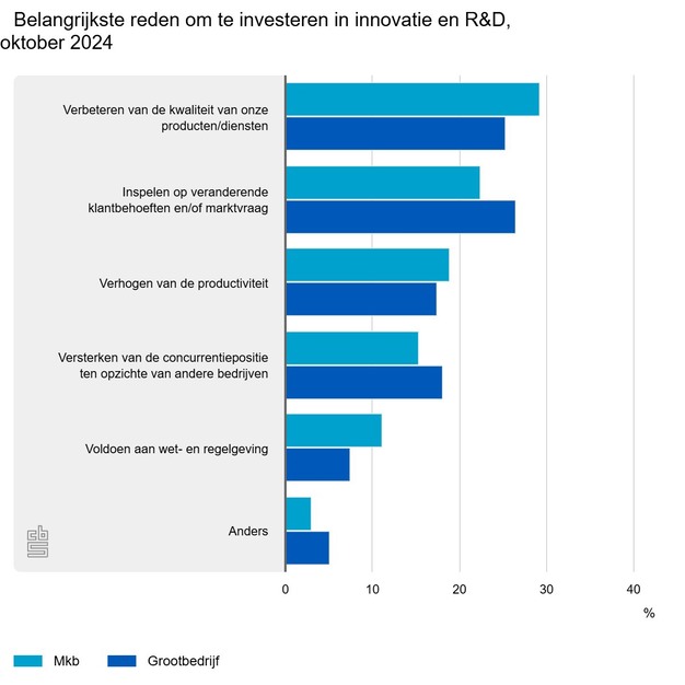 Binnen het grootbedrijf is het inspelen op veranderende klantbehoeften of marktvraag met ruim 26 procent de meest genoemde reden om te innoveren. Bijna 19 procent van de mkb-bedrijven geeft het verhogen van de productiviteit als belangrijkste reden aan. Bij het grootbedrijf ligt dit met ruim 17 procent een fractie lager. Iets meer dan 11 procent van de mkb-bedrijven geeft aan dat het voldoen aan wet- en regelgeving de belangrijkste reden is om te investeren in innovatie en R&D. Bij het grootbedrijf wordt dit met ruim 7 procent minder vaak aangegeven. Hierbij gaat het relatief vaak om bedrijven in de industrie en de bouwnijverheid.
