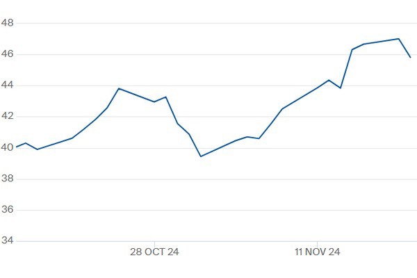 Ten opzichte van de TTF-contractprijzen op dinsdag is er maandag een eurootje af. Q1 2025 zakte dinsdag zelfs terug tot 45,8 euro per megawattuur.
