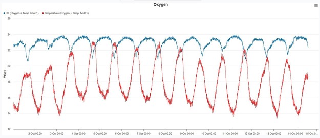 Naast de fotosynthese-efficiëntie en PAR op bladniveau zijn ook de zuurstof en temperatuur in het wortelmilieu inzichtelijk in het portaal. Op verzoek van klanten zijn ook andere sensordat zoals ruimtetemperatuur, RV en CO2 zichtbaar. Klik hier voor vergroting van een zuurstofprofiel.