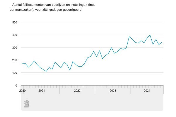 In november zijn, voor zittingsdagen gecorrigeerd, 19 meer bedrijven failliet verklaard dan in oktober, meldt het CBS. Dat is een stijging van 6 procent. De trend van het aantal faillissementen is al ruim 2 jaar stijgend. In de eerste 11 maanden van 2024 waren er ongeveer een derde meer faillissementen dan in dezelfde periode van 2023.