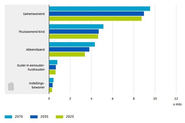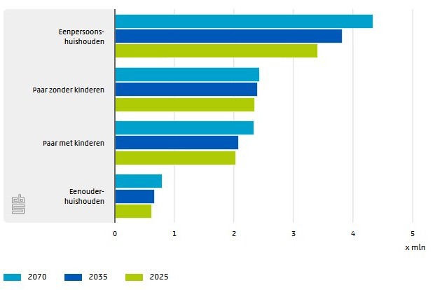 Het aantal huishoudens neemt tussen 2025 en 2035 naar verwachting toe met 567 duizend. 72 procent van de toename bestaat uit eenpersoonshuishoudens. Momenteel bestaat 40 procent van de huishoudens uit één persoon, in 2035 is dit 42 procent. In 2070 is het aandeel eenpersoonshuishoudens naar verwachting gegroeid tot 44 procent. Ook het aantal paren (met en zonder kinderen) en het aantal eenouderhuishoudens neemt naar verwachting toe, maar deze groei is kleiner.
