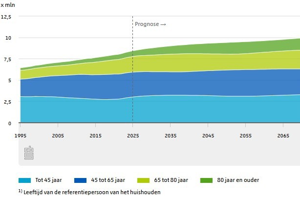 De voorziene groei van het aantal huishoudens komt voornamelijk voor rekening van 65-plussers. Momenteel zijn er 2,5 miljoen huishoudens met een referentiepersoon van 65 jaar of ouder, in 2035 zijn dat er 3,0 miljoen en in 2070 is dit toegenomen tot 3,6 miljoen. Binnen deze leeftijdsgroep zal het aantal huishoudens van 80 jaar of ouder naar verwachting ruim verdubbelen tussen 2025 en 2070.