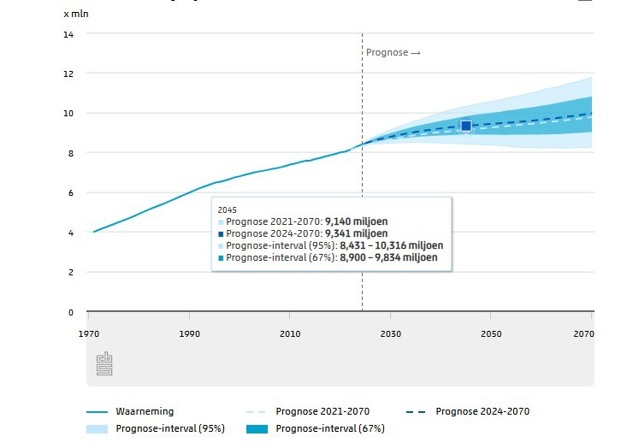 Op 1 januari 2035 telt Nederland naar verwachting 9,0 miljoen huishoudens. Nu zijn dat er 8,4 miljoen. Er komen vooral meer eenpersoonshuishoudens bij; deze nemen tot 2035 met ruim 400 duizend toe tot 3,8 miljoen. Een steeds groter deel daarvan zijn alleenwonende ouderen. In 2070 zullen er naar verwachting bijna 10 miljoen huishoudens zijn. Dat meldt het CBS op basis van de Huishoudensprognose 2024-2070.