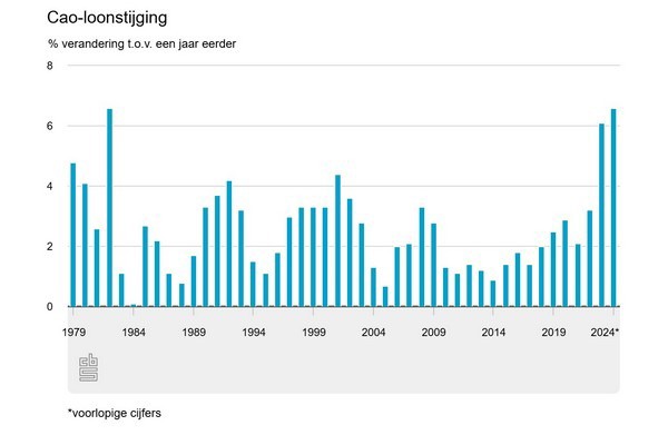 In 2024 lagen de cao-lonen gemiddeld 6,6 procent hoger dan in 2023, toen de lonen met 6,1 procent stegen. De loonstijging in 2024 is de hoogste sinds 1982. Dit meldt het CBS op basis van nieuwe cijfers.