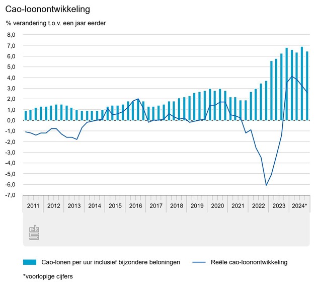 In het laatste kwartaal van 2024 lagen de cao-lonen 6,5 procent hoger dan in hetzelfde kwartaal een jaar eerder. Sinds de tweede helft van 2023 zijn de cao-lonen ieder kwartaal meer dan 6,2 procent gestegen met de hoogste toename in het derde kwartaal van 2024 (6,9 procent).