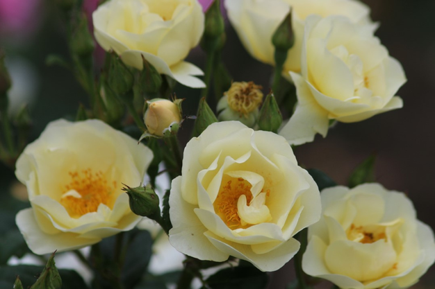 Amourin ('Visauslen'): Compacte klimroos van Viva International met lichtgele bloemknoppen. De roomwitte, halfgevulde bloemen hebben een aangename geur. Opvallende oranjerode bottels in het najaar. Groeit tot maximaal 2 meter hoog.