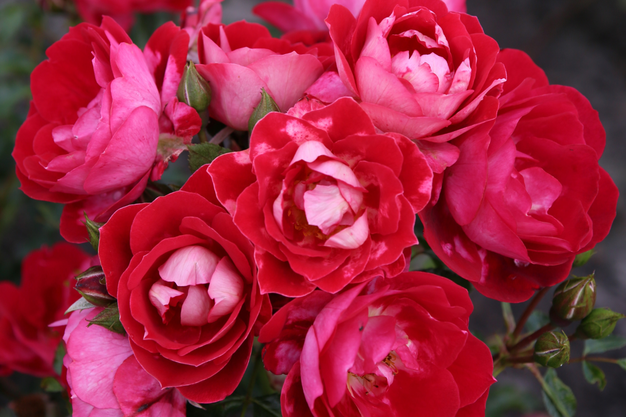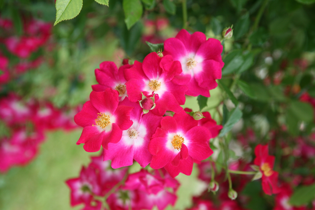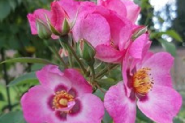 Libertas ('TAN99134'): Deze rijkbloeiende klimroos van Rosen Tantau wordt maximaal 2,5 meter hoog. De diep rozerode bloemen met wit oog zijn iets gevuld en aantrekkelijk voor insecten. In het najaar verschijnen veel kleine ovale oranjerode bottels.