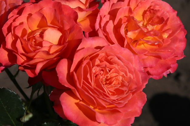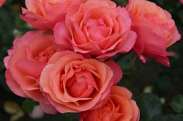 Coral Lions-Rose ('Korzwanlio'): Bossig opgaand groeiende floribundaroos van Kordes. De gevulde bloemen zijn oranjeroze en geuren licht. Hoogte: 100 - 120 cm.