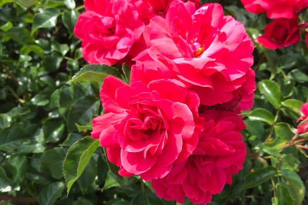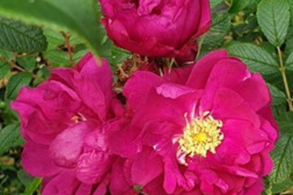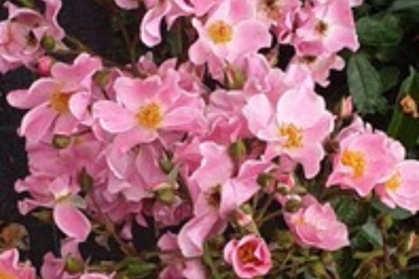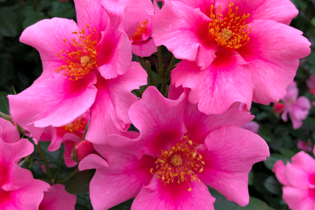 Caracho ('Korbrumila'): Brede en bossig groeiende bodembedekker van Kordes met halfgevulde, rozerode bloemen en opvallende gele meeldraden. Ze geuren licht en schonen goed. Na de bloei verschijnen ronde oranje bottels. Hoogte: 60 - 80 cm.