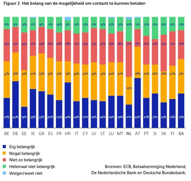 Uit het onderzoek van de ECB blijkt verder dat een ruime meerderheid van de ondervraagden uit alle eurolanden (62%) het belangrijk vindt dat winkeliers contant geld accepteren. Van die groep vindt de helft het zelfs 'zeer belangrijk' dat die mogelijkheid bestaat. Dat geldt zelfs in landen als België, Luxemburg en Finland, waar consumenten voor het merendeel van de aankopen aan de kassa andere betaalmogelijkheden gebruiken. Nederlanders hechten minder aan acceptatie van contant geld in winkels: 45% zegt dit belangrijk of zeer belangrijk te vinden.