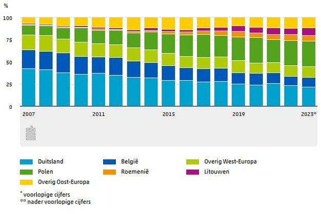 Van de buitenlandse vrachtwagens vervoerden Poolse vrachtwagens in 2023 de meeste goederen (30 miljoen ton) vanuit of naar Nederland. Dat is 29,1 procent van het totaal vervoerde gewicht door buitenlandse vrachtwagens. In 2007 vervoerden Poolse vrachtwagens 10,9 procent van het door buitenlandse vrachtwagens vervoerde gewicht. Ook Roemeense en Litouwse vrachtwagens vervoerden in de periode 2007-2023 meer goederen. Het aandeel door Belgische en Duitse vrachtwagens vervoerde gewicht van of naar Nederland is in deze periode gehalveerd.