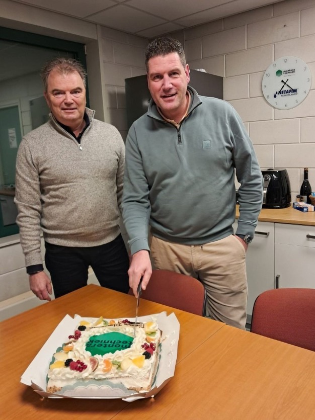 Foto rechts: Tom Zwijsen en Marco Braam snijden de taart aan.
