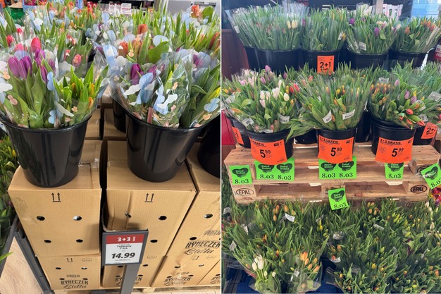 - Lidl: Koop 3 boeketten (7 tulpen per boeket) voor 14,99 zł en krijg nog eens 3 boeketten gratis. Dat betekent dat de prijs per boeket 7,5 zł (€1,78) is.