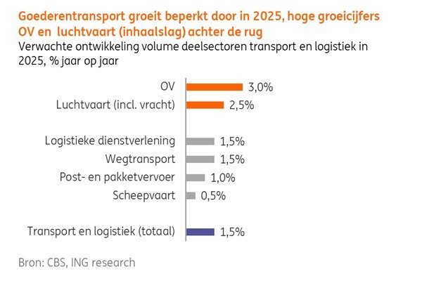 Bedrijven in transport en logistiek zien de markt in 2025 herstellen. Er zijn weer meer bouwmaterialen nodig, consumenten kopen meer goederen en de industrie remt niet langer sterk af. Tegelijkertijd zijn de onzekerheden in de internationale activiteiten groot en kunnen importtarieven vanuit de Verenigde Staten de goederenhandel opschudden en dempen. Ook ligt de sterk gegroeide stroom van Chinese pakketten door online consumentenaankopen onder een vergrootglas. Aan de kant van het personenvervoer zijn er minder forenzen in het OV en gaat het herstel daar veel langer duren. In de luchtvaart blijft de vraag wel sterk, maar is de capaciteit begrensd en wijken reizigers uit. Al met al kan de sector als geheel in 2025 een volumegroei van 1,5% verwachten. Dit blijkt uit het nieuwe vooruitzicht Transport en Logistiek van ING Research.