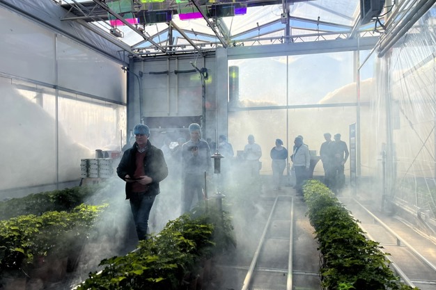 Cock van Bommel, Business Development Manager bij ErfGoed, opende de middag en heette de bezoekers welkom. Samen met Bart van Meurs, directeur bij Division Q, gaf hij een uitgebreide toelichting op het AirFlow-systeem en de lopende praktijkproef. Met behulp van een rookmachine werd de werking van het systeem gedemonstreerd, waarbij zichtbaar werd hoe de lucht gelijkmatig door de vloer verdeeld wordt en uniform door het gronddoek omhoog komt. De lucht komt hierdoor onder vandaan bij de plant terecht. De gehele kap werd voorzien van lucht, waarbij ca. 5 m3 per m2 per uur gedoseerd werd.