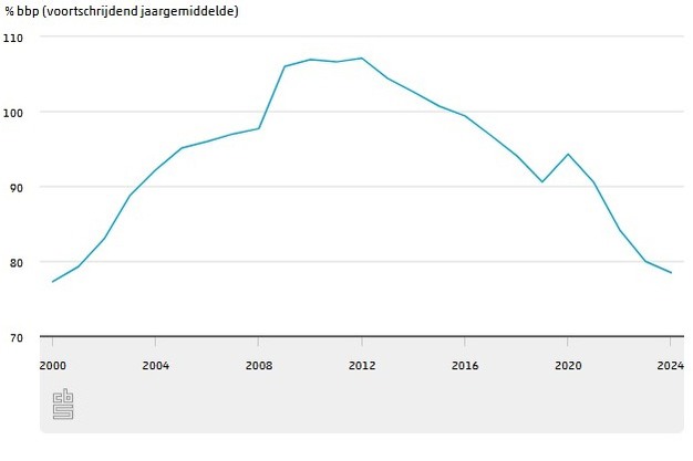De woninghypotheekschuld nam in 2024 toe met 35,7 miljard euro vergeleken met een jaar eerder. De hypotheekschuld liep hiermee sterker op dan vorig jaar doordat de huizenprijzen stegen en er meer woningen werden verkocht. Doordat de economie nominaal harder groeide dan de schuldtoename, nam de hypotheekschuld als percentage van het bbp af; van 80 procent in 2023 naar 78,5 procent in 2024. Dit is het laagste niveau na 2000.