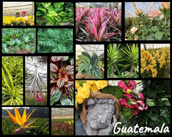 In Guatemala worden veel verschillende soorten bloemen en planten geteeld. "Bij snijbloemen worden rozen, anjers, chrysanten, heliconias, opvullers, paradijsvogels, gembers en anthuriums geteeld. Het assortiment sierplanten bestaat uit tropische variëteiten zoals scindapsus, epipremnum (gouden pothos), philodendron, marantas, codiaeum (croton), marble queen, aglaonemas en schefflera. Planten voor koudere klimaten omvatten klimop, peperomias, dieffenbachia, vaste planten, poinsettia's en eenjarigen. Snijgroen omvat chamaedorea, ledervaren, xate, boomvaren en cyca bladeren. Andere beschikbare producten zijn stelen zoals beaucarneas, yucca, dracaenas, cordylines en sanderianas, evenals bromelia's, orchideeën, tillandsia's en gedroogde bloemen.