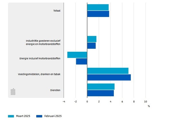 Bij de snelle raming was de inflatie in maart 3,7 procent, meldt het CBS. Deze raming is berekend op basis van nog onvolledige brongegevens. In februari was de inflatie 3,8 procent.