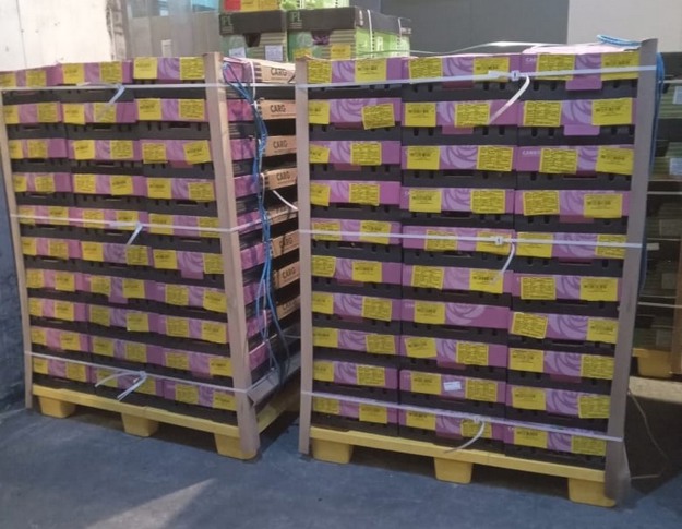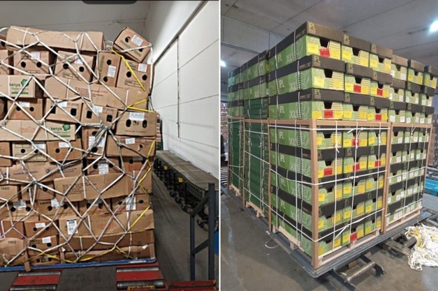 Links: Reguliere pallet uit Kenia. Rechts: Cargolite luchtpallet uit Kenia