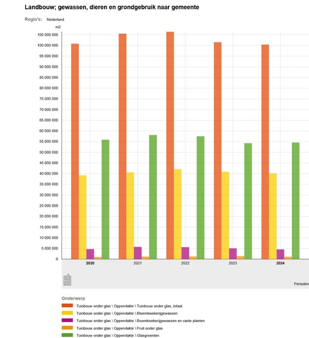 Opvallend is dat het CBS op de ene pagina met de cijfers van de oogstraming 4830 hectare glasgroenten voor 2024 noteert en op de andere pagina met areaalcijfers 5455 hectare voor glasgroenten in 2024.