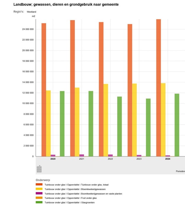 Uit de CBS-cijfers op basis van de landbouwtelling komt naar voren dat het vooral de glasgroenten zijn die groeien in Westland. Het areaal bloemkwekerijgewasen, boomkwekerijgewassen- en vaste planten en fruit onder glas is in 2024 gedaald.