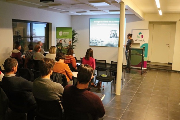 Nadat omschakelingsconsulent Bart Thoelen de algemene principes van biologisch telen toegelicht had (zie foto hierboven), deelden de bedrijven Rosephine (biologische bloemen) en boomkwekerij Mentens hun praktijkervaringen. Daarna belichtte Viaverda enkele proeven met betrekking tot biologische sierteelt.