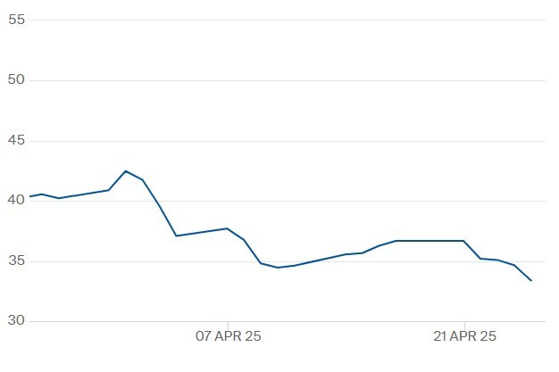 De TTF-gasprijs voor het contract 'winter 2025' t/m 25 april. Klik hier voor de actuele gascontractprijzen.