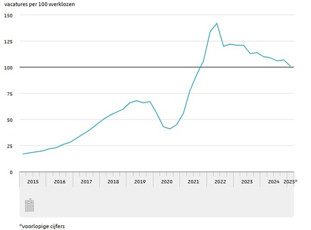 Het aantal vacatures nam in het eerste kwartaal af met 7 duizend terwijl het aantal werklozen met 16 duizend toenam. De arbeidsmarkt werd hierdoor minder krap. Voor elke 100 werklozen waren er 101 openstaande vacatures. Het aantal banen daalde voor het eerst in ruim 4 jaar licht (-14 duizend). Dat blijkt uit nieuwe cijfers van het CBS.