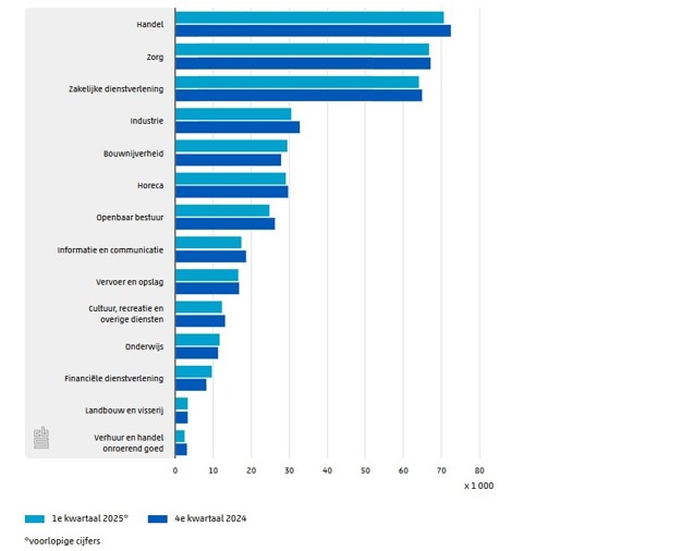 Aan het einde van het eerste kwartaal stonden er 395 duizend vacatures open. Dat zijn 7 duizend vacatures minder dan in het vierde kwartaal van 2024. In dat kwartaal steeg het aantal juist met 4 duizend, wat de eerste toename was sinds halverwege 2022. De meeste vacatures zijn in de handel, de zorg en de zakelijke dienstverlening. Deze drie bedrijfstakken zijn goed voor ruim de helft van alle openstaande vacatures.