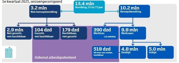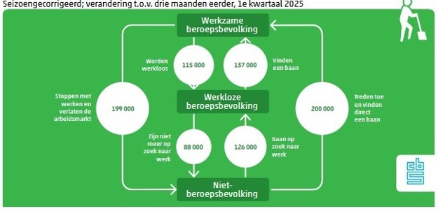 Aan de ene kant kwamen er werklozen bij doordat mensen op zoek gingen naar werk maar niet direct een baan vonden (van niet-beroepsbevolking naar werkloos). Deze stroom was groter dan de tegenovergestelde stroom van werkloos naar niet-beroepsbevolking. Per saldo was er daardoor in het eerste kwartaal van 2025 een toestroom van 38 duizend werklozen vanuit de niet-beroepsbevolking. Dit is meer dan in het vorige kwartaal (23 duizend). De niet-beroepsbevolking bestaat uit mensen die niet kort geleden naar werk hebben gezocht en/of daarvoor niet direct beschikbaar waren.