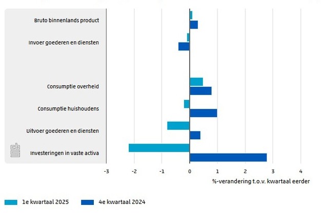 Volgens de eerste berekening van het CBS, op basis van nu beschikbare gegevens, steeg het bruto binnenlands product (bbp) in het eerste kwartaal van 2025 met 0,1 procent ten opzichte van het vierde kwartaal van 2024. De economische groei is de afgelopen vier kwartalen steeds kleiner geworden. De stijging van het bbp in het eerste kwartaal van 2025 is vooral toe te schrijven aan een kleinere afbouw van de voorraden dan een kwartaal eerder. Daarnaast droeg de consumptie door de overheid licht positief bij.
