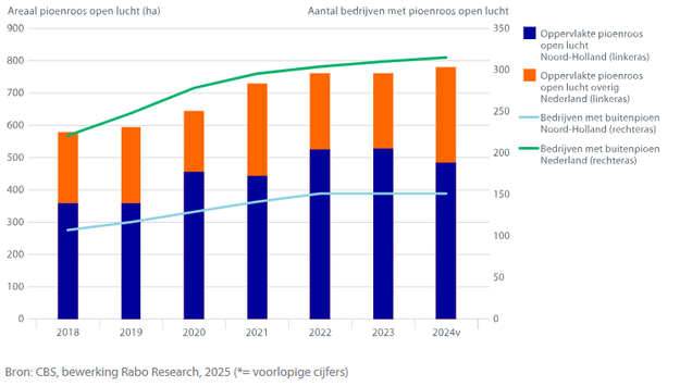 Het areaal pioenrozen in Nederland is na jaren van groei gestabiliseerd. Dat constateert RaboResearch bij een update van de Rabo-tuinbouwbarometer. In 2018 bedroeg het buitenareaal 939 hectare, oplopend tot 1.264 hectare in 2024 (voorlopige cijfers). Het areaal is verspreid over veel bedrijven met een kleine oppervlakte. In Nederland melden 316 bedrijven een areaal met pioenrozen in open lucht. Daarbij kan sprake zijn van bloementeelt of van een stekkenteelt voor de vermeerdering van uitgangsmateriaal voor andere telers of particulieren. De provincie die er bovenuit springt, is Noord-Holland. Daar bevindt zich 780 hectare (62%) van het landelijke areaal in de open lucht.
