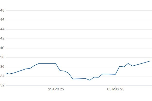 De TTF-gasprijs voor het contract 'winter 2025' t/m 13 mei. Klik hier voor de actuele gascontractprijzen.