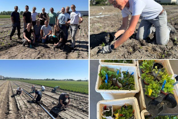 Door de vele zonuren en warme temperaturen van de afgelopen dagen, lagen de aluminium beregeningsbuizen al klaar om na het planten de dahlia's meteen te beregenen. Met de hulp van collega's en vrijwilligers verliep het planten voorspoedig en voor deze harde werkers was er een heerlijke lunch en koffie met gebak geregeld.