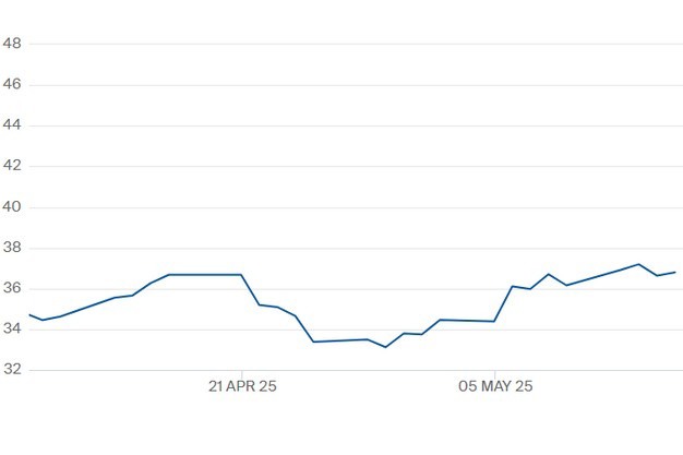 De TTF-gasprijs voor het contract 'winter 2025' t/m 15 mei. Klik hier voor de actuele gascontractprijzen.