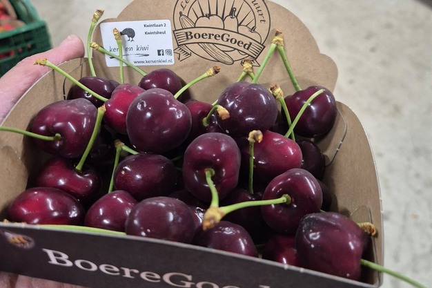 © Kers en KiwiTholen - Afgelopen zaterdag zijn de eerste kaskersen geoogst in de kas van René en Gerda Arkesteijn in Kwintsheul. De voormalig siertelers zijn tijdens de energiecrisis gestopt met hun amaryllisteelt. Al snel daarna liepen de hobbyplannen uit de hand, zegt teler René en dus staat de kas van 9000 vierkante meter nu vol kiwi's en kersen. "Vorig jaar had ik een heel klein beetje kersen. Dit jaar zijn het er meer. De mensen die vorig jaar hier aan huis kersen gekocht hebben, staan alweer voor de deur."