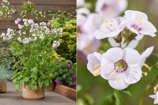 Een vernieuwende selectie van Polemonium heeft fijn, in lila tonen geveerd blad en helderwitte bloemen met een uitgesproken violet centrum. 'Violet Eye' is vroeg- en rijkbloeiend, heeft een sterk wortelgestel, is meeldauwvrij en goed winterhard.