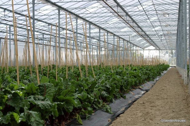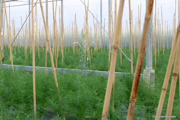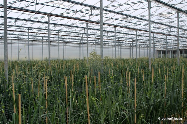 Om onder meer de koolsoorten goed van elkaar gescheiden te houden, worden ze ook afgeschermd met tussengevels, met daarin een rits. Als we over het betonpad verder lopen, komen we venkel tegen, wortelen en ook uien. Hier valt het bloemengaas op, zoals je ook in de chrysantenteelt ziet.