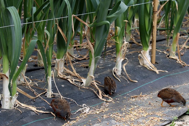 Wat ook opvalt als je door de kas loopt is dat er kwartels rondscharrelen. "Een project van mijn zoon", legt Bastiaan uit. "De kwartels scharrelen tussen de prei, en eten rupsen." Ook staan er op diverse plekken graanpollen tussen het gewas. Ook voor biologische bestrijding, zo blijkt. De graanpollen zijn waardplanten voor luisbestrijders.